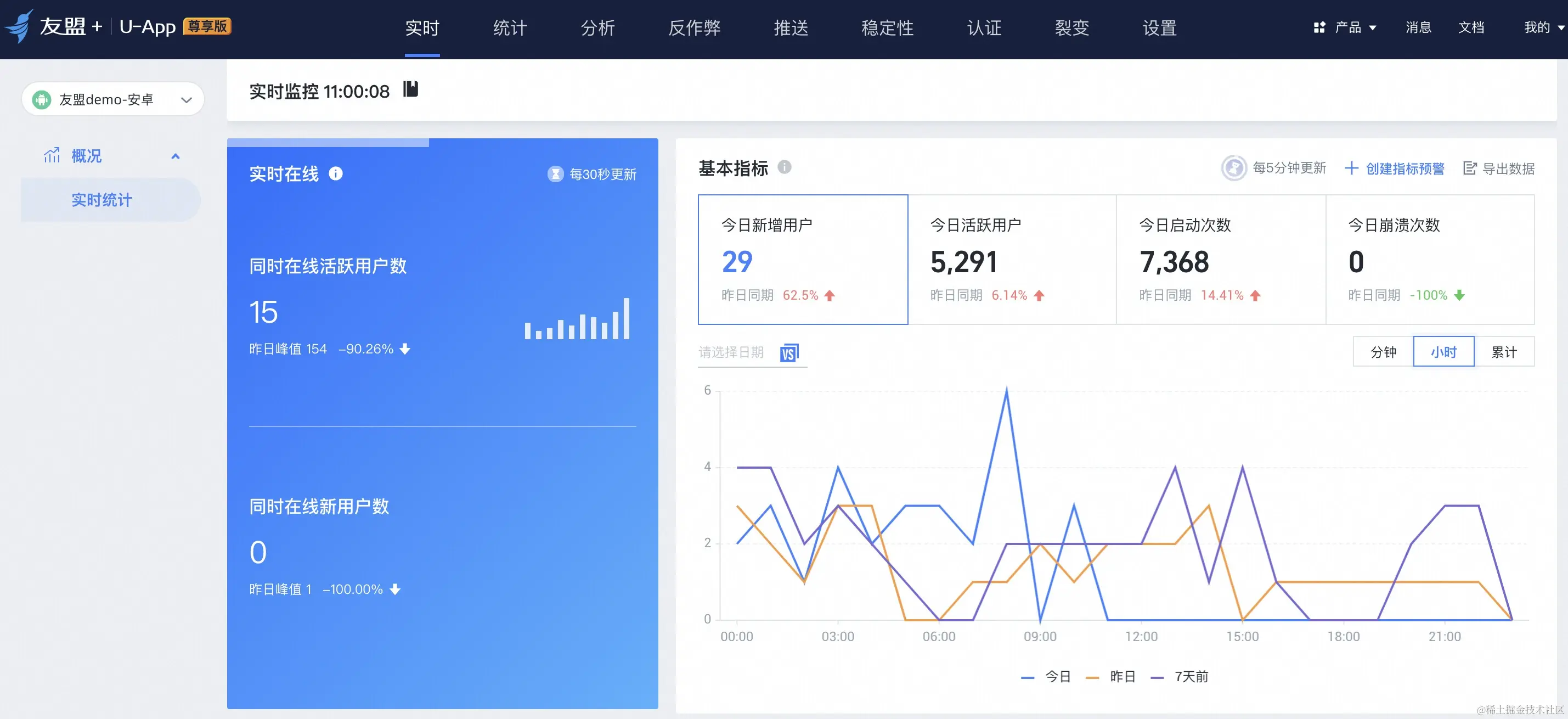 友盟基础指标分为实时和离线指标两类,分别对应实时和离线两条计算链路,通过计算新增、活跃和启动等基础指标为客户提供整体概览数据