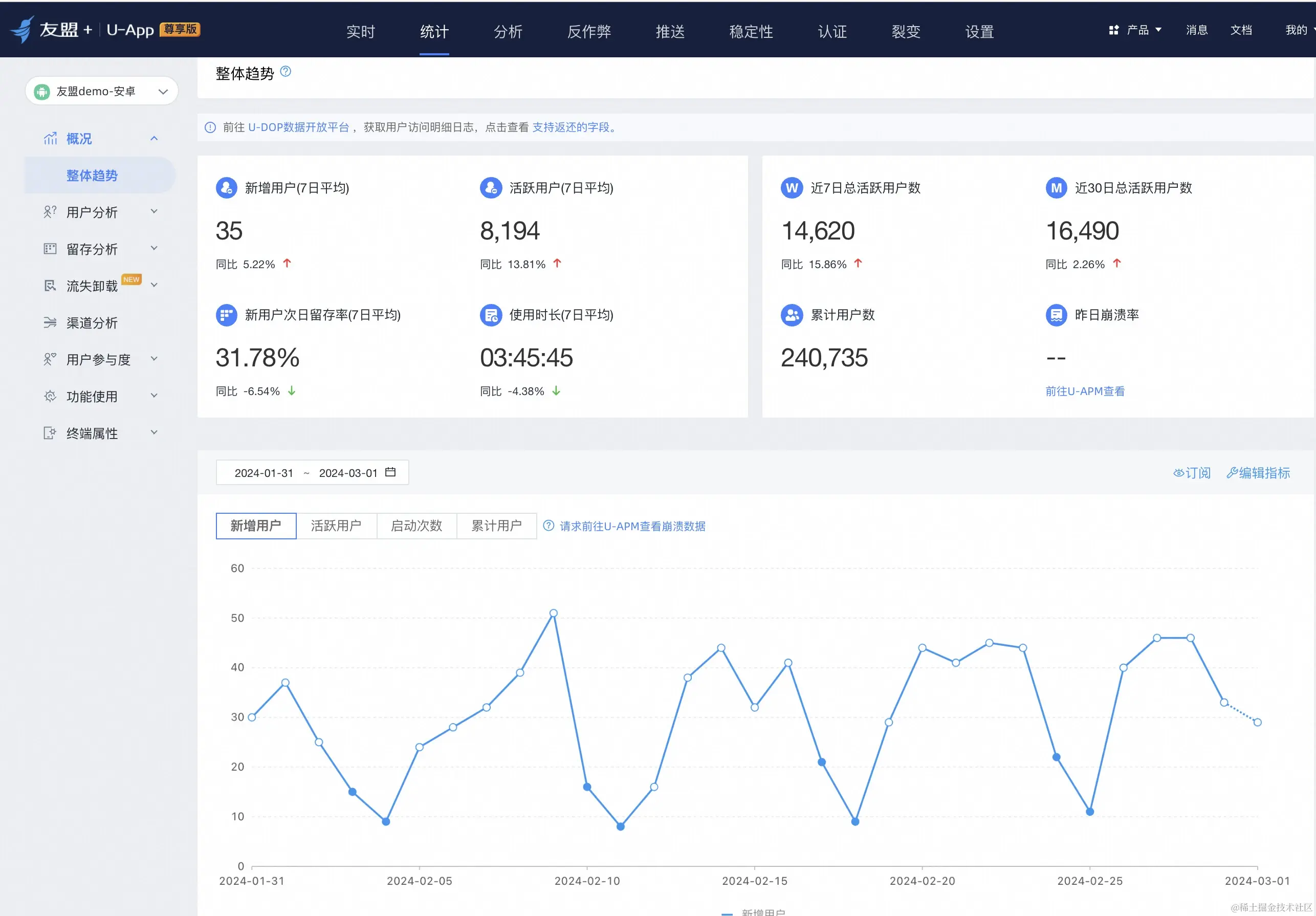 作为国内最大的移动应用统计服务商,其统计分析产品 U-App & U-Mini & U-Web 为开发者提供基础报表及自定义用户行为分析服务,能够帮助开发者更好地理解用户需求,优化产品功能,提升用户体验,助力业务增长。