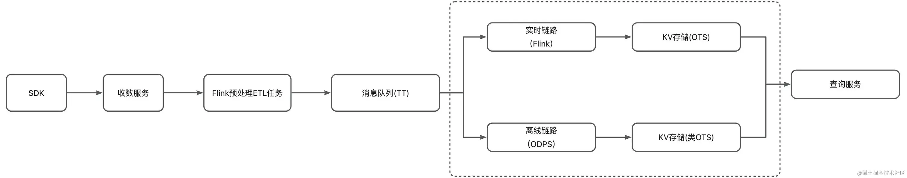 上述计算链路即传统的 lambda 架构,数据经过预处理后写入消息队列,离线链路同步消息队列数据到离线数仓进行加工处理将计算结果同步到 OTS (类 Hbase 存储)中;实时链路通过 Flink 直接消费消息队列的数据聚合成统计指标后写入 OTS,查询服务将离线和实时两份指标进行统一展示如上图所示。传统 lambda 架构的优缺点如下: