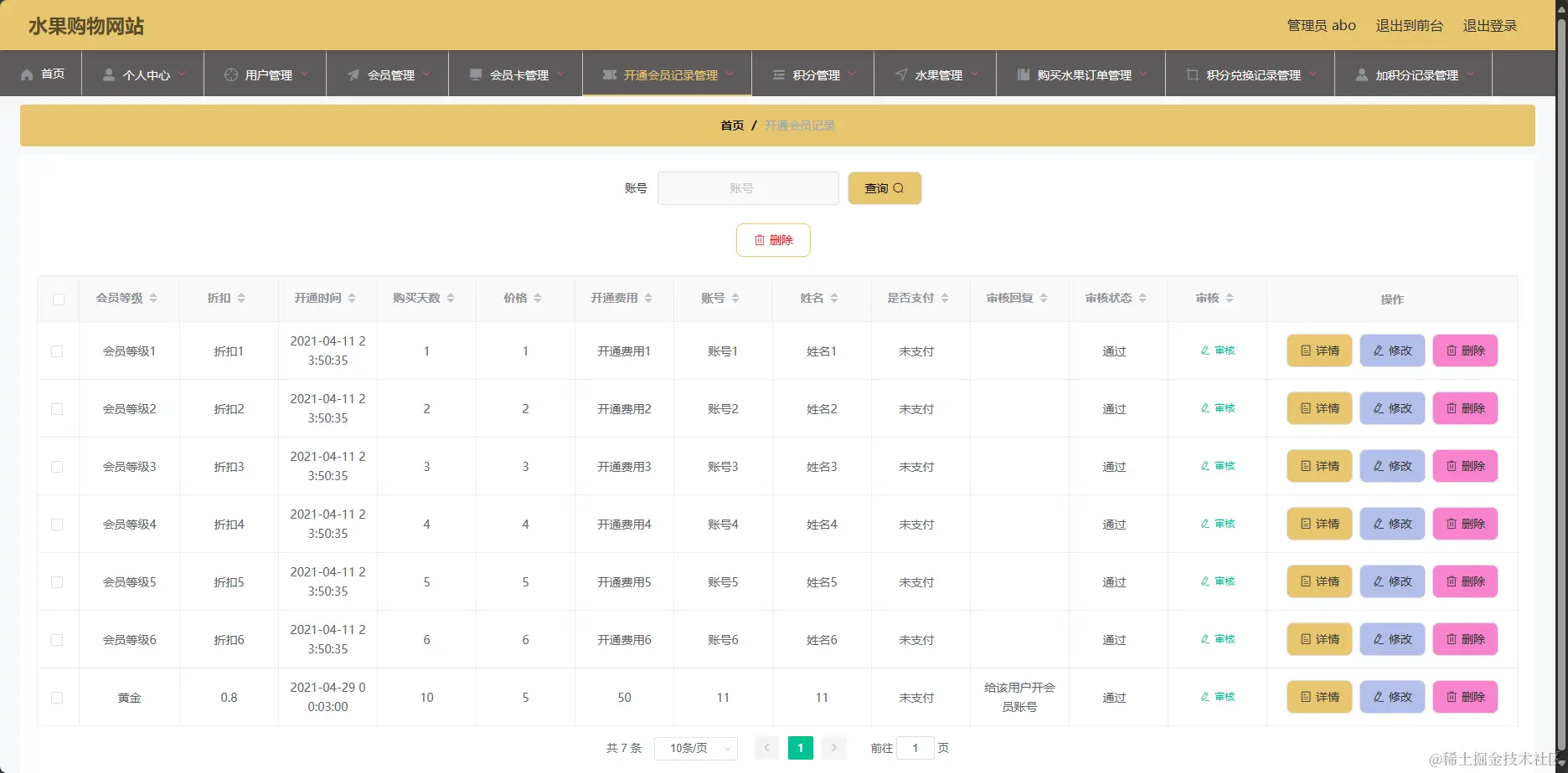 管理系统-会员开通信息页面