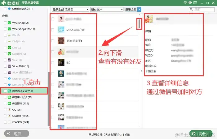 通过很多方法,还是无法找到删除的好友,我们可以试试软件的扫描功能。通过数据蛙苹果恢复专家的深度扫描,迅速找到误删的好友,然后通过浏览该好友的信息:昵称、微信号、手机号等,手动把对方加回来。微信通讯录好友删除了怎么恢复?具体操作步骤如下: