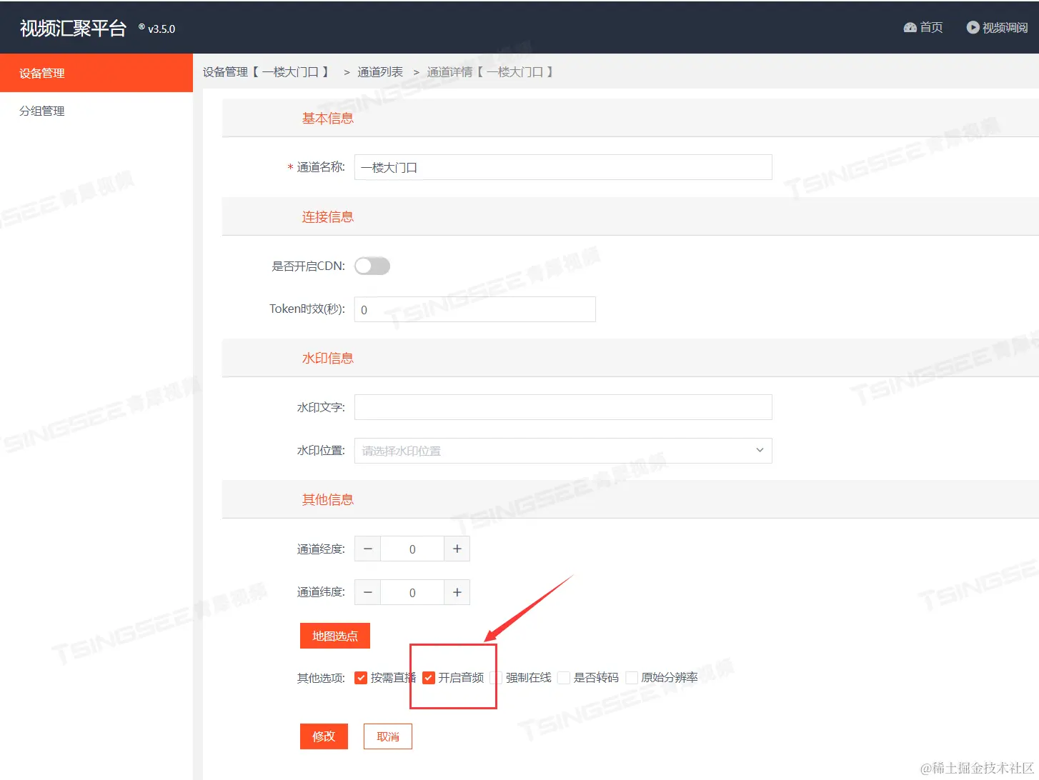 在EasyCVR平台中,依次点击【设备管理】-【国标设备】-【查看通道】-【通道编辑】-【开启音频】,如图:
