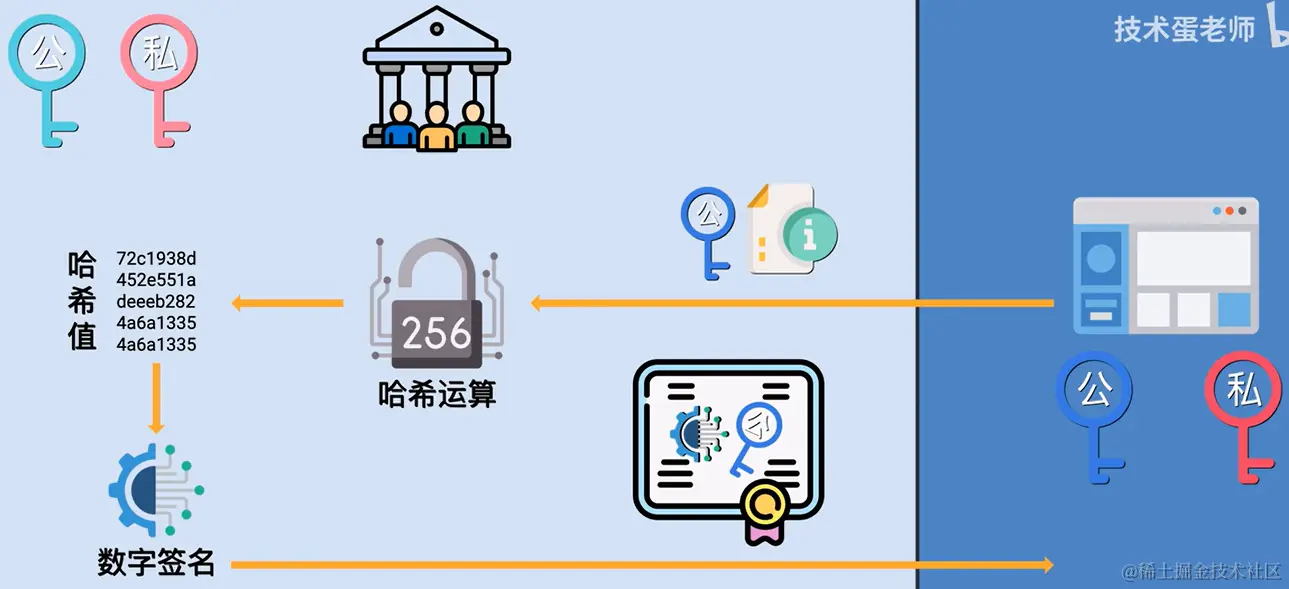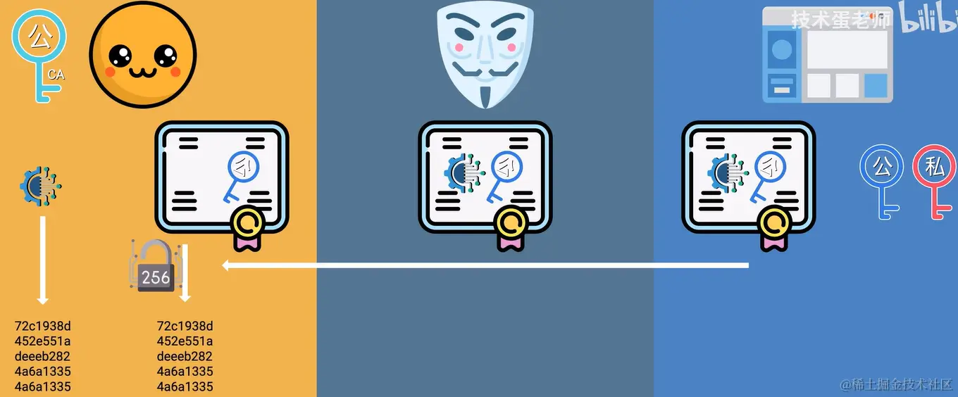 接着你对收到的数字证书内容,进行同样的哈希运算,也得到一串哈希字符。