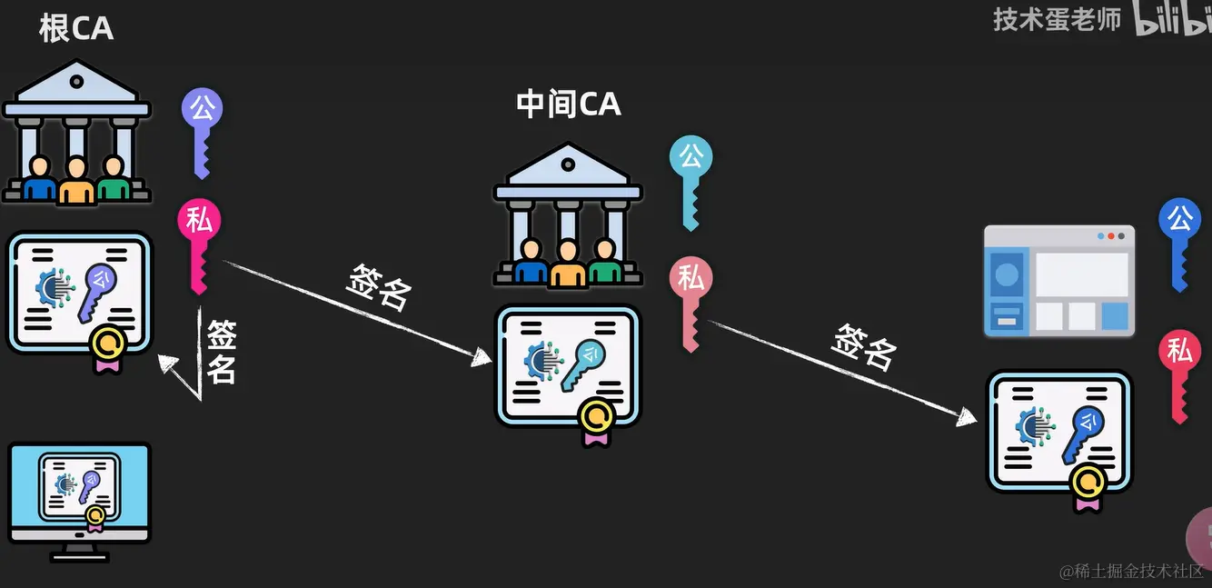 当你访问网站的时候,网站会把CA数字签名的数字证书发给你。为了证明没有中间人更改过公钥,你需要用CA签名时候生成的公钥给数字签名解密,这样会得到一串哈希字符。