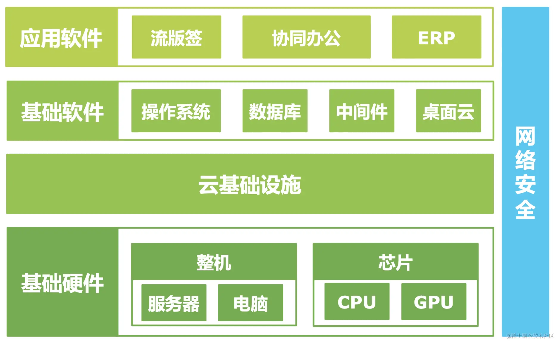 从下面这张图可以直观的看出来,整个信创产业包含的范围还是比较广泛的,包括基础硬件(服务器、电脑、CPU、GPU)、云等基础设施、基础软件、应用软件、网络安全等IT产业链核心技术产品。