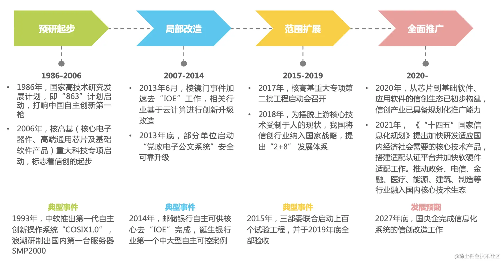 我们国家的整个信创产业可以分为4个阶段,早在80年代就已经开始关注到自主可控,从操作系统到服务器都有一些水花,但随着“棱镜门”、“技术封锁”等黑天鹅事件的发生,信创的步伐逐渐开始加快,在2018年国家将整个信创产业上升到战略级别,而根据计划在2027年国央企需要完成信息化系统的全部信创改造,可见至少在国家层面信创产业和技术都是值得留意的。