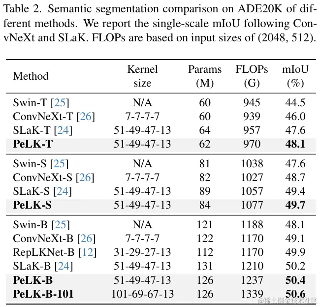 对于语义分割,在ADE20K上评估PeLK作为主干网络的效果。