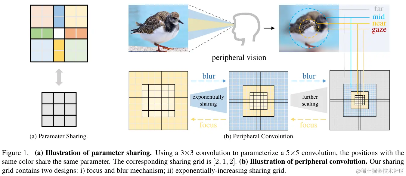 - 聚焦和模糊机制。如图 1b 所示,将细粒度参数保留在卷积核的中心区域,其对应共享网格设置为 1 (即不共享)。对于外围区域,利用大范围参数共享来探索外围视觉的空间冗余。