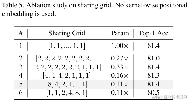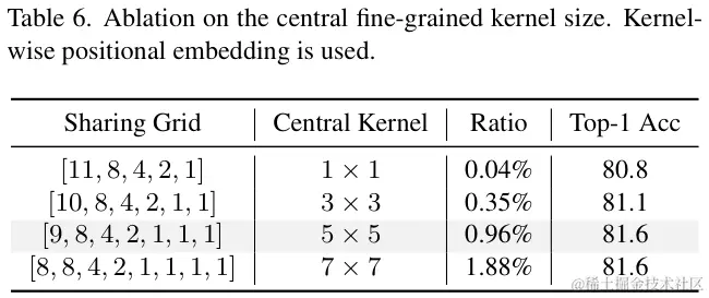如图 3 所示,通过引入位置嵌入,可以区分共享区域中的特定位置,从而弥补共享带来的局部细节模糊的问题。实际上,这可以被视为向输入特征添加相对位置信息的偏置。值得注意的是,同一个阶段中的所有内核共享相同的位置嵌入 ,因此 带来的额外参数可以忽略不计。这种设计以一种廉价而优雅的方式解决了由于共享权重而导致的位置不敏感问题,特别是对于非常大的内核。