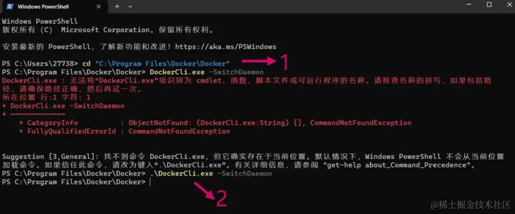 还需在windows powershell中运行命令(.\DockerCli.exe -SwitchDaemon)把docker daemon启动。注意要先cd到Docker Desktop安装路径(一般默认Docker Desktop安装路径为C:\Program Files\Docker\Docker)下再运行上述命令。