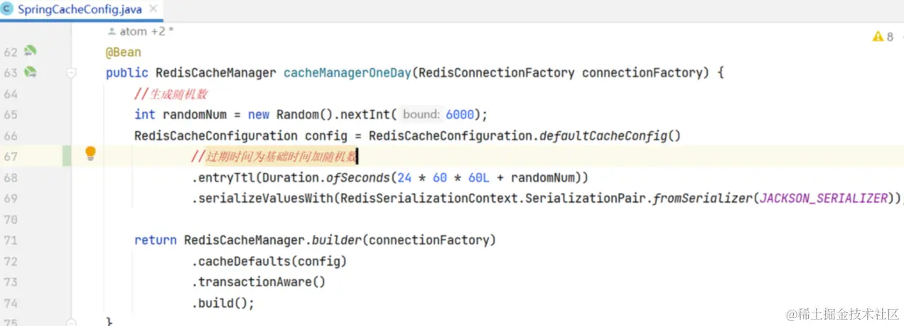 具体实现:在framework工程中定义缓存管理器指定过期时间加上随机数。