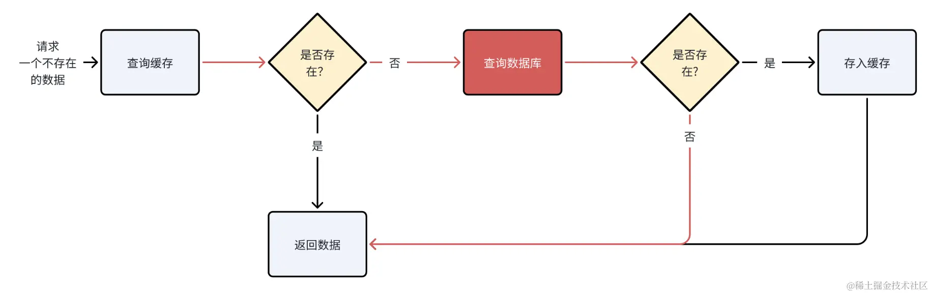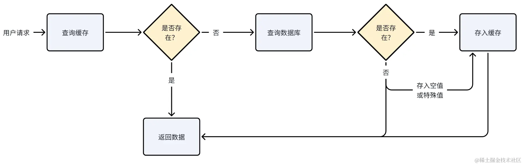 当查询数据库得到的数据不存在,此时我们仍然去缓存数据,缓存一个空值或一个特殊值的数据,避免每次都会查询数据库,避免缓存穿透。