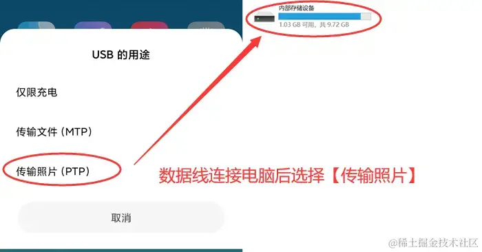步骤2:在手机弹出的选项框中选择 【传输照片】 选项,然后就可以到电脑上操作并上传照片啦!