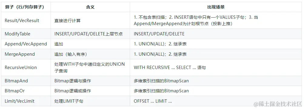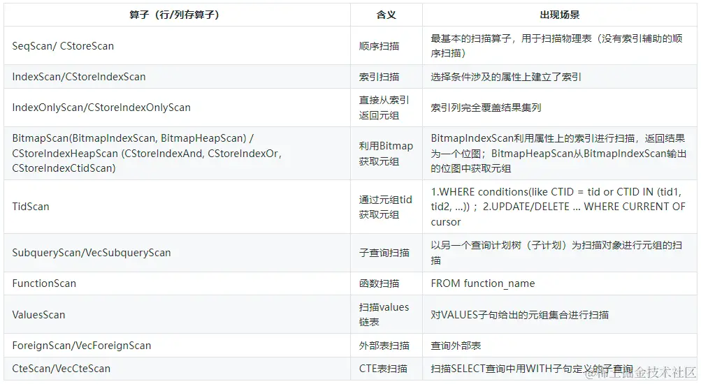 扫描算子用来扫描表中的数据,每次获取一条元组作为上层节点的输入, 存在于查询计划树的叶子节点,它不仅可以扫描表,还可以扫描函数的结果集、链表结构、子查询结果集。一些比较常见的扫描算子如表所示。