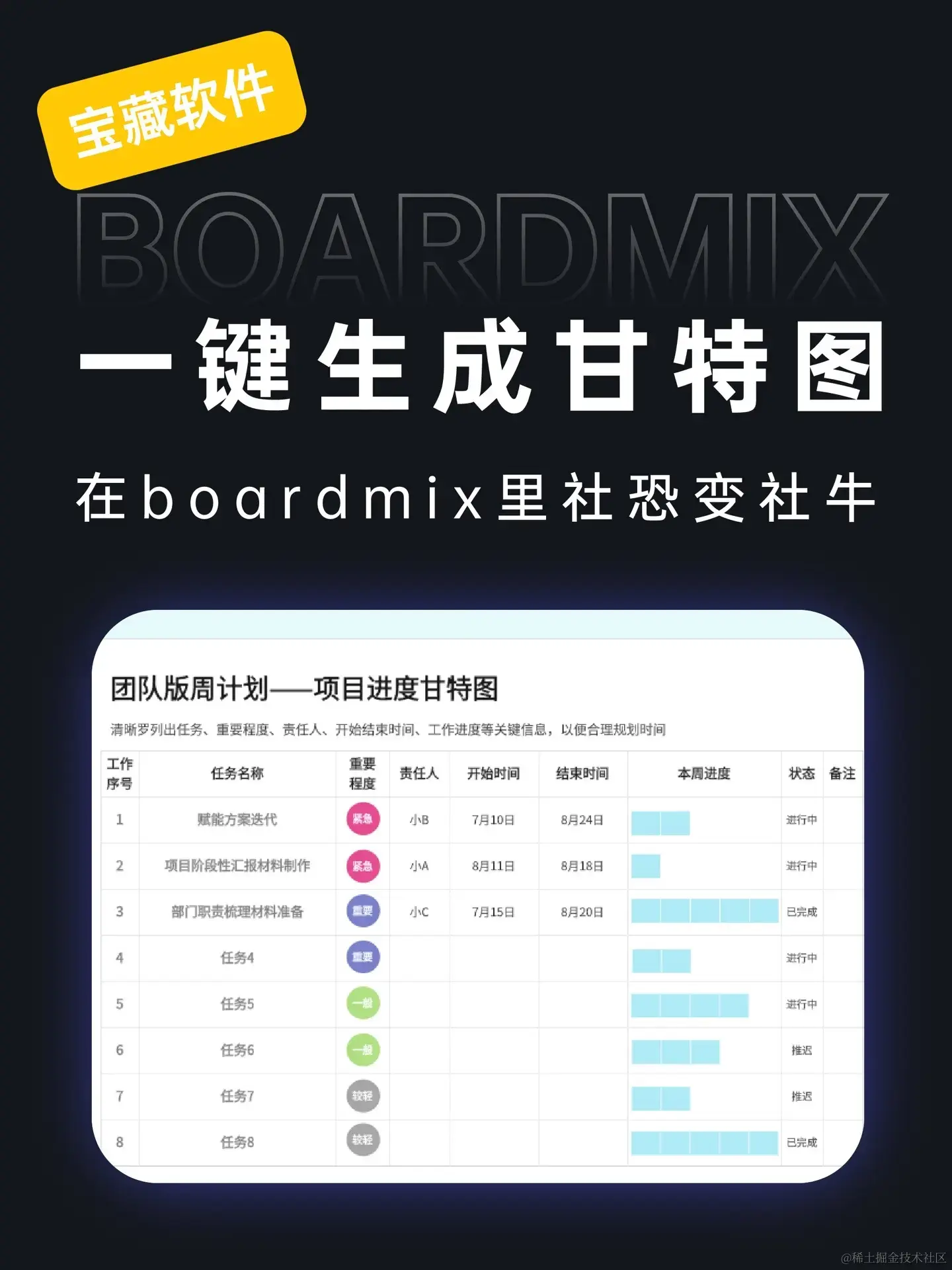 boardmix 是一款基于浏览器的在线白板软件,提供了丰富的项目管理可视化模板,包括甘特图模板、时间轴模板、项目计划模板、项目时间线模板等。它支持使用 AI 生成内容和思维导图,为用户提供了一个知识分享和探索的空间。