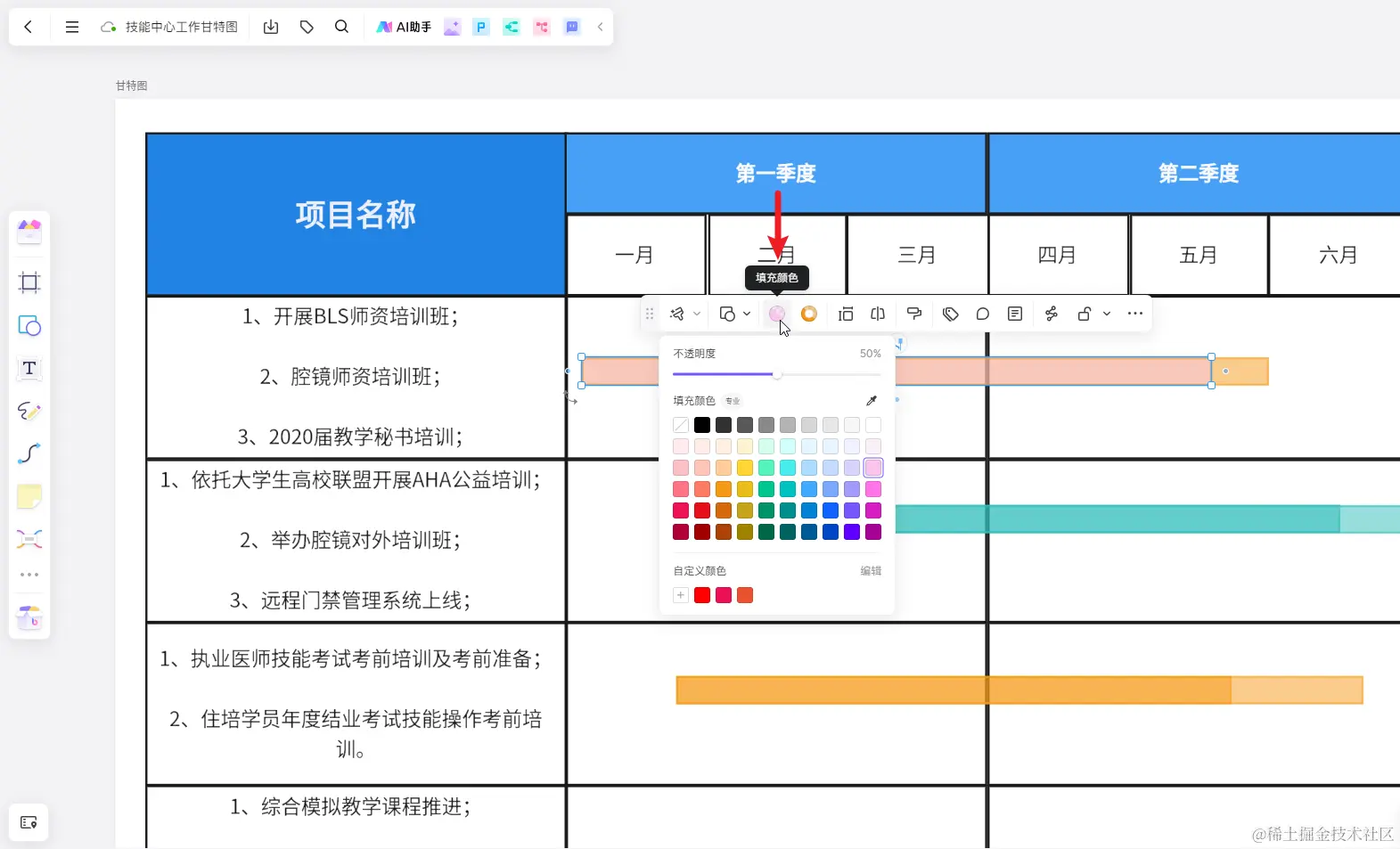甘特图模板为每个条形预先设置了不同的颜色,如果你不喜欢默认的颜色,可以选中矩形,点击工具栏上方的「填充颜色」,在弹出的浮窗,可从中选取自己喜欢的颜色。