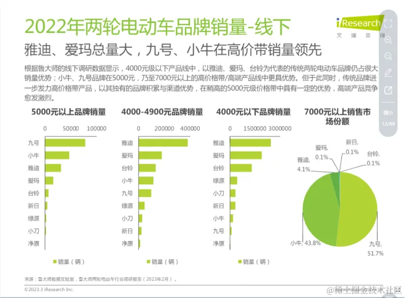 艾瑞咨询发布的《2023年中国两轮电动车行业白皮书》数据显示,2022年电动自行车的线下销量方面,在4000-4900元的品牌销量中,小牛排在第四位,落后于雅迪、爱玛和台铃。(业内普遍认为,4000元以上的两轮电动车就属于高端市场)5000元以上品牌销量中,小牛落后于九号,排在第二位。7000元以上产品的市场份额中,小牛占比43.8%,也落后于九号。