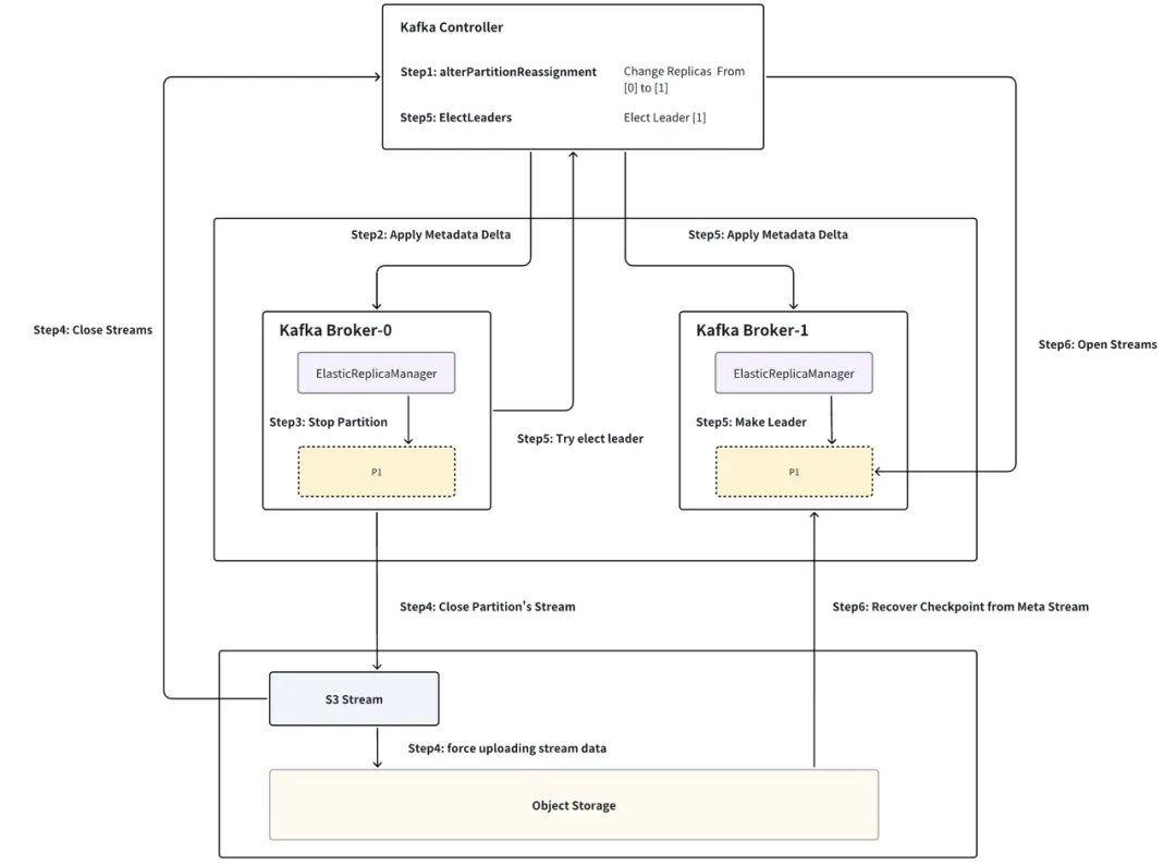 如下图,以分区 P1 从 Broker-0 迁移至 Broker-1 为例,流程分为六步: