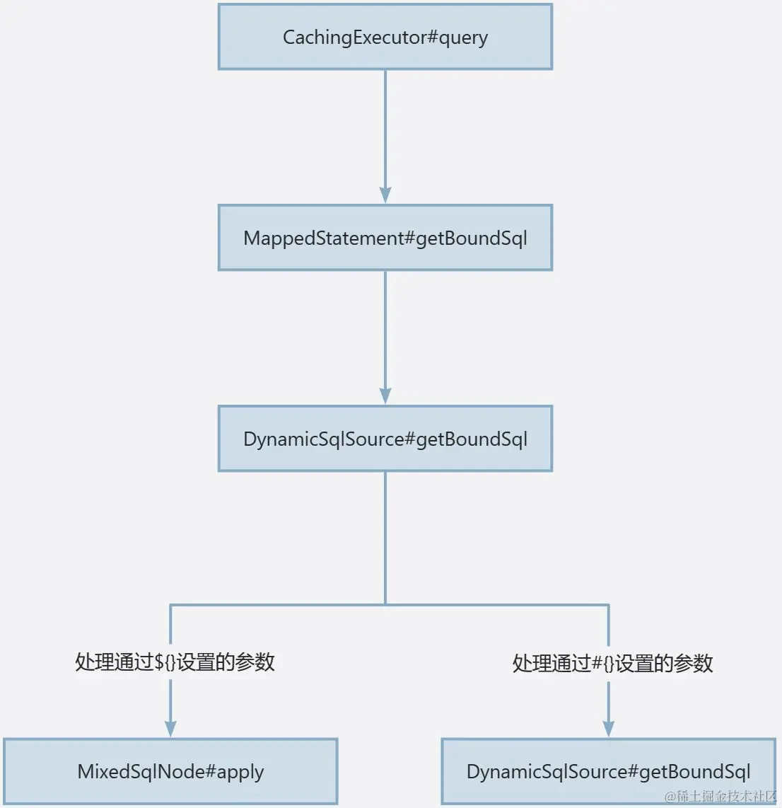 其中第 5 行调用的rootSqlNode.apply(context)会处理通过“${}”方式设置的参数,将参数值直接拼接到 SQL 语句中;而第 9 行中调用的SqlSource sqlSource = sqlSourceParser.parse(context.getSql(), parameterType, context.getBindings())会处理通过“#{}”方式设置的参数,将其替换为占位符“?”。
