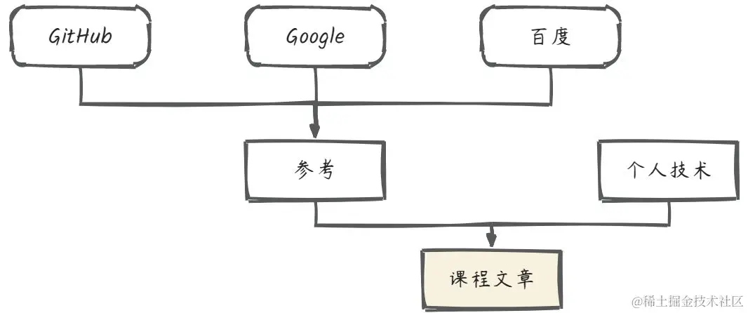 我会调研 GitHub、Google、百度相似的文章(如果有的话),然后根据这些调研文章作为课程写作输入信息的一部分,另一部分来自于我的工作经验、个人对技术的理解等,最终输出课程文章。这篇文章是一个结合了其他文章的优点,并注入我个人技术理解的原创文章,既不闭门造车,又用个人技术能力赋能课程文章,最终确保课程达到一个很高的质量。