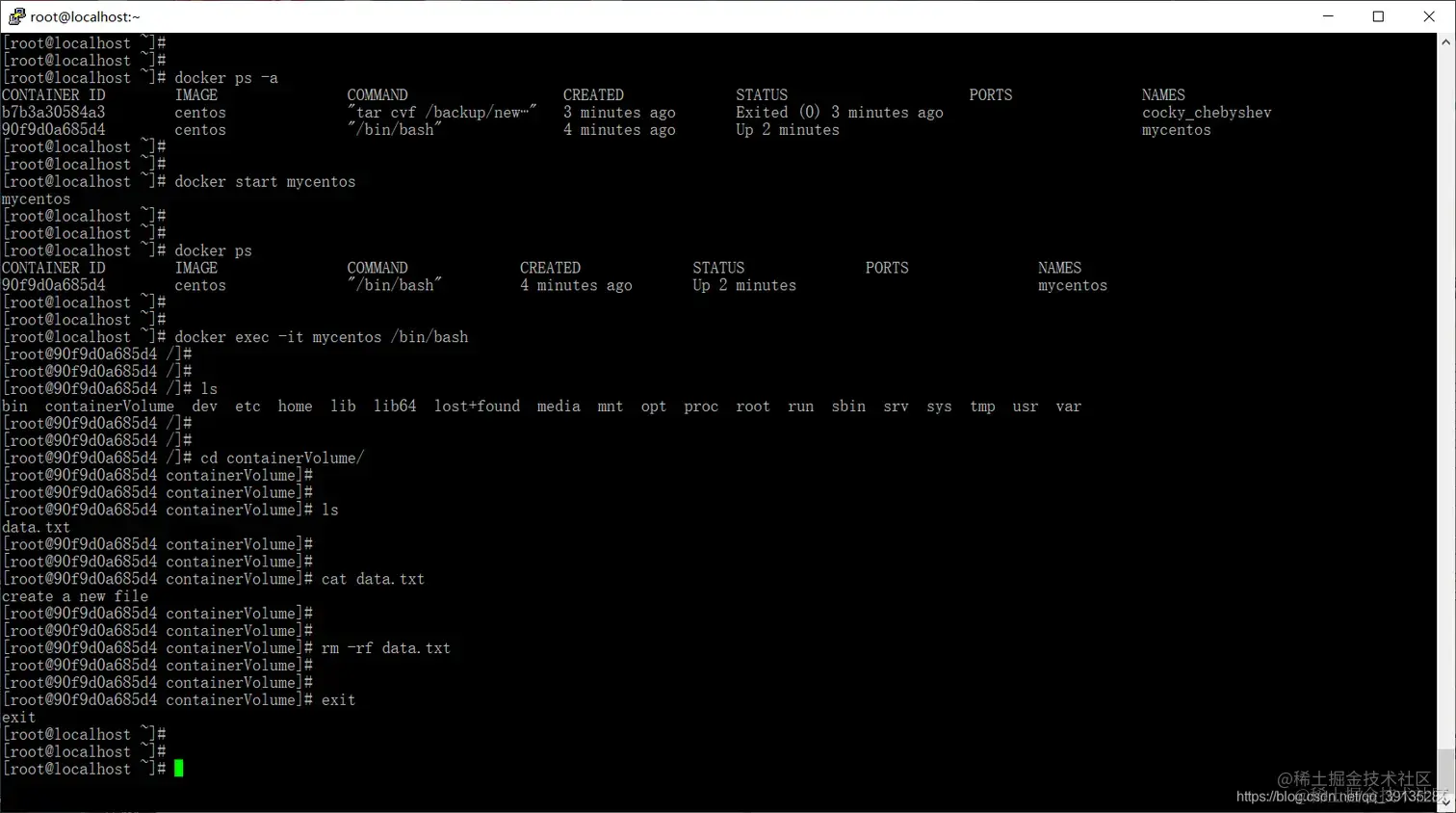 数据卷压缩文件要选择容器备份目录下的,(即 如果容器备份目录为/backup,则数据卷导出文件的路径为/backup/newcentos.tar)。 1、删除数据卷容器mycentos中的数据卷里的data.txt文件,模拟数据的丢失。2、对丢失数据的数据卷容器