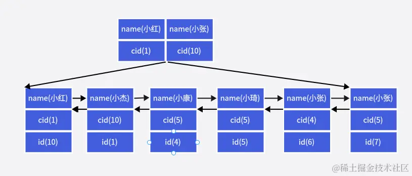 我们就会得到上面这样索引结构(当然树的深度也有可能是别的层数,为了方便理解我就画了两层),我们可以看到这棵树完全是以name的顺序构建的树,只有在name的排序规则不能排的情况下才会用到cid比如树中有两个小张。