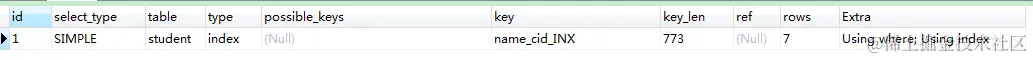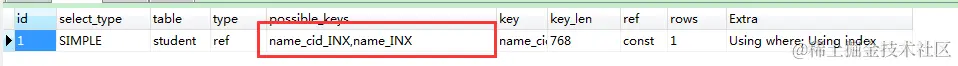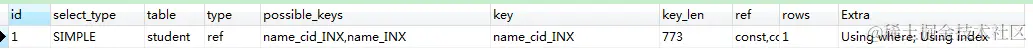 表明已经优化成了SELECT * FROM student WHERE name='小红' and cid=1 ; 所以走了索引!