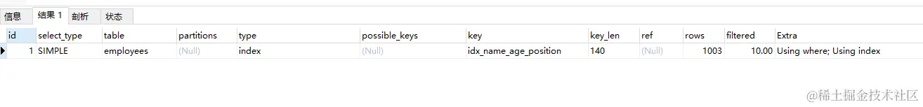 在这张表中我们构建了一个:idx_name_age_position联合索引,这时候如果们再分析这条sql的执行计划: