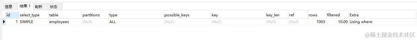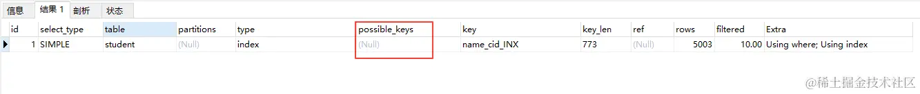 我们可以看到possible_keys这一列为空,这一列的意思是“可能用到的索引”,key为实际使用的索引,按照逻辑讲第一个为null