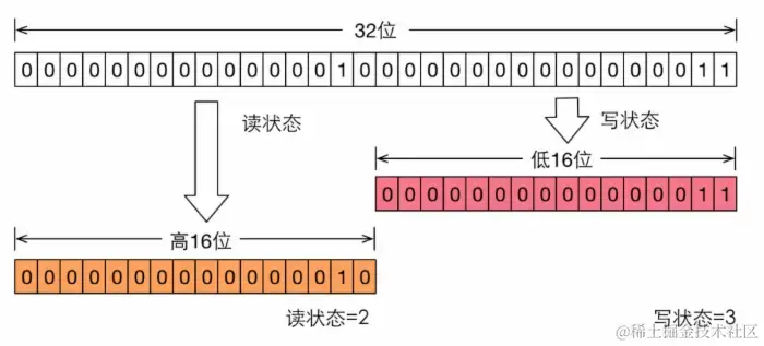 读写锁对于同步状态的实现是在一个整形变量上通过“按位切割使用”:将变量切割成两部分,高16位表示读,低16位表示写。