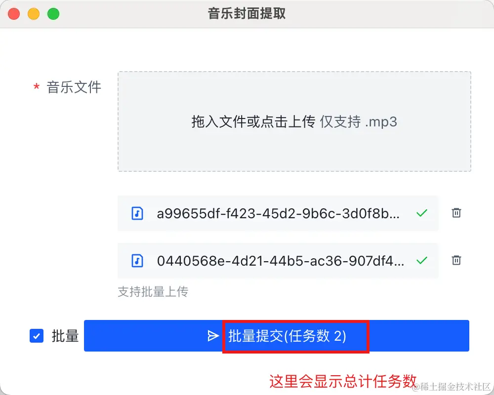 我们可以点击或者直接拖入多个文件,一次加不完没关系,可以点击继续添加,如果添加错误了也可以删除,同时按钮那里还会显示总计的任务数,最后确认无误后,我们点击批量提交就可以了