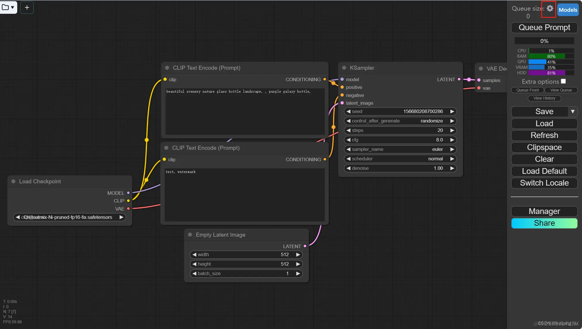 很多小伙伴刚开始不知道如何启动。我们可以点击“加载默认”,就会加载出来默认的工作流,文生图工作流。然后点击“添加提示词队列”,即可运行一次。当前运行中的节点会有一个绿色的框,而且节点上有绿色进度条。