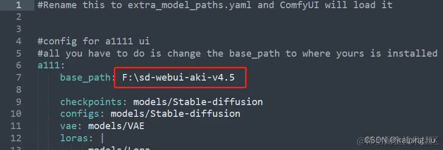 如果电脑上安装过webui,建议共用模型。也不用存放两份模型,占用电脑磁盘空间。首先将comfy ui根目录下的“extra_model_paths.yaml.example”文件重命名为“extra_model_paths.yaml”。