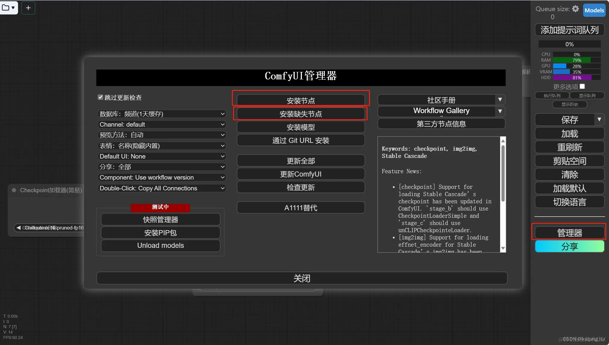 也可以点击“显示队列”,查看运行中的队列。 队列中运行中的任务可以点击取消。如果运行中的工作流一直不结束,可以去绘世启动器的控制台页面查看日志。