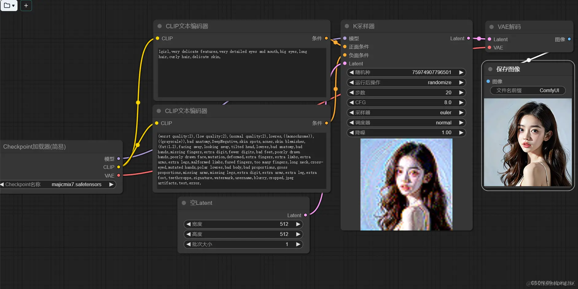 第一个节点是“checkpoint加载器”,在这里可以切换模型。“CLIP文本编码器”区域即可输入提示词,上面是正向提示词,下面是负向提示词。“空Latent” 里面可以设置图片大小。“K采样器”里面可以设置随机种子(seed)、步数(step)、CFG、采样器(Sampler)等。