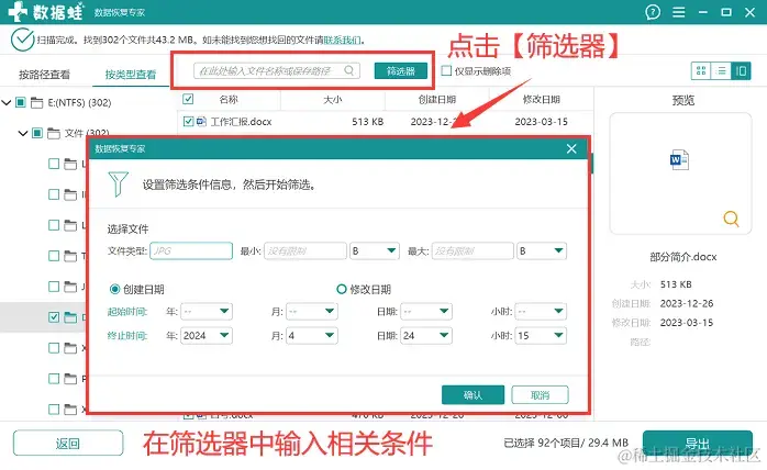 步骤3:扫描完成后,在界面上选择需要查看的文件类型,在右侧可以对扫描到的文件进行勾选,如果扫描到的文件比较多,可以尝试使用【筛选器】对文件进行定位。