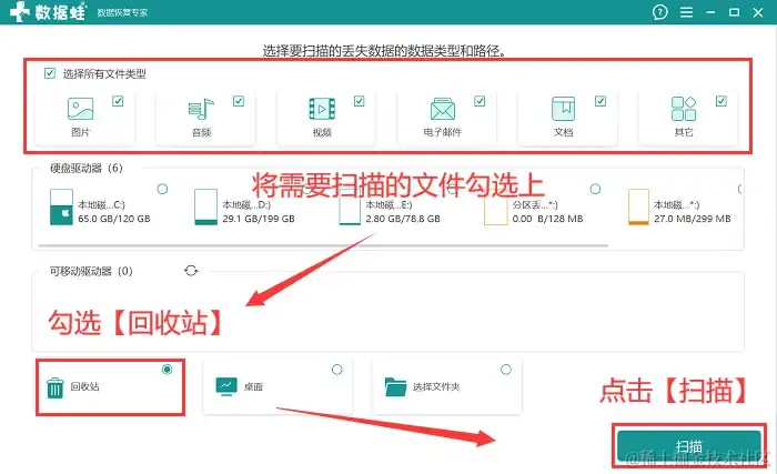 步骤2:在软件的选择界面,可以对需要扫描的相应文件类型进行勾选,并对【回收站】进行勾选,完成后,单击【扫描】;