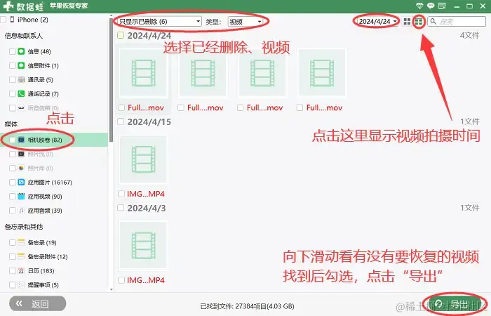 Step 2:通过筛选条件**【只显示已删除、视频、视频拍摄日期】快速找到要恢复的视频。这时我们会看到一些视频,可以只勾选想要恢复的视频,然后点击【导出】**按钮。