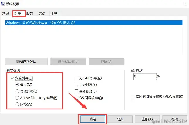 (5)点击 【确定】 按钮保存设置。此时,电脑会在下次启动时自动进入安全模式。