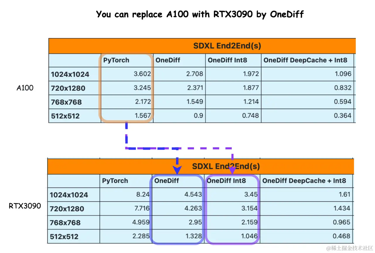 在OneDiff的加持下,RTX3090甚至可以超越A100的性能,帮助企业和用户大幅节省使用A100的成本。