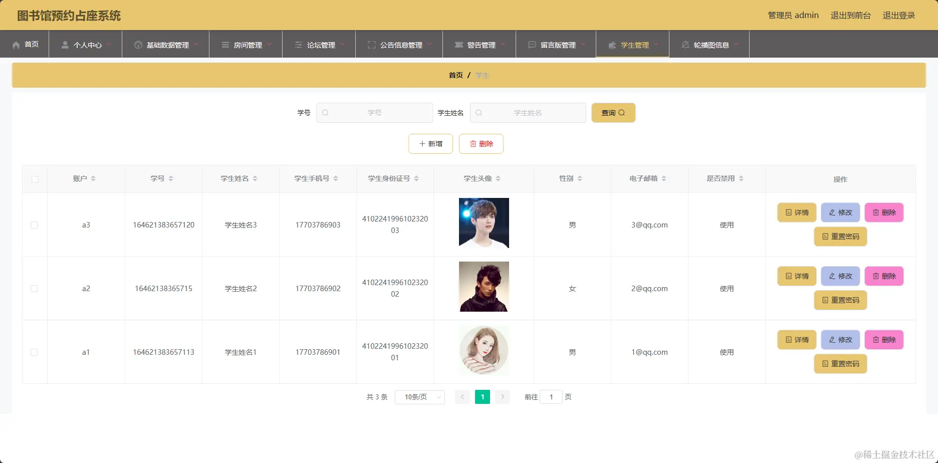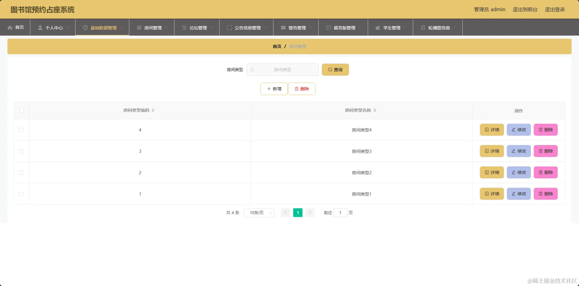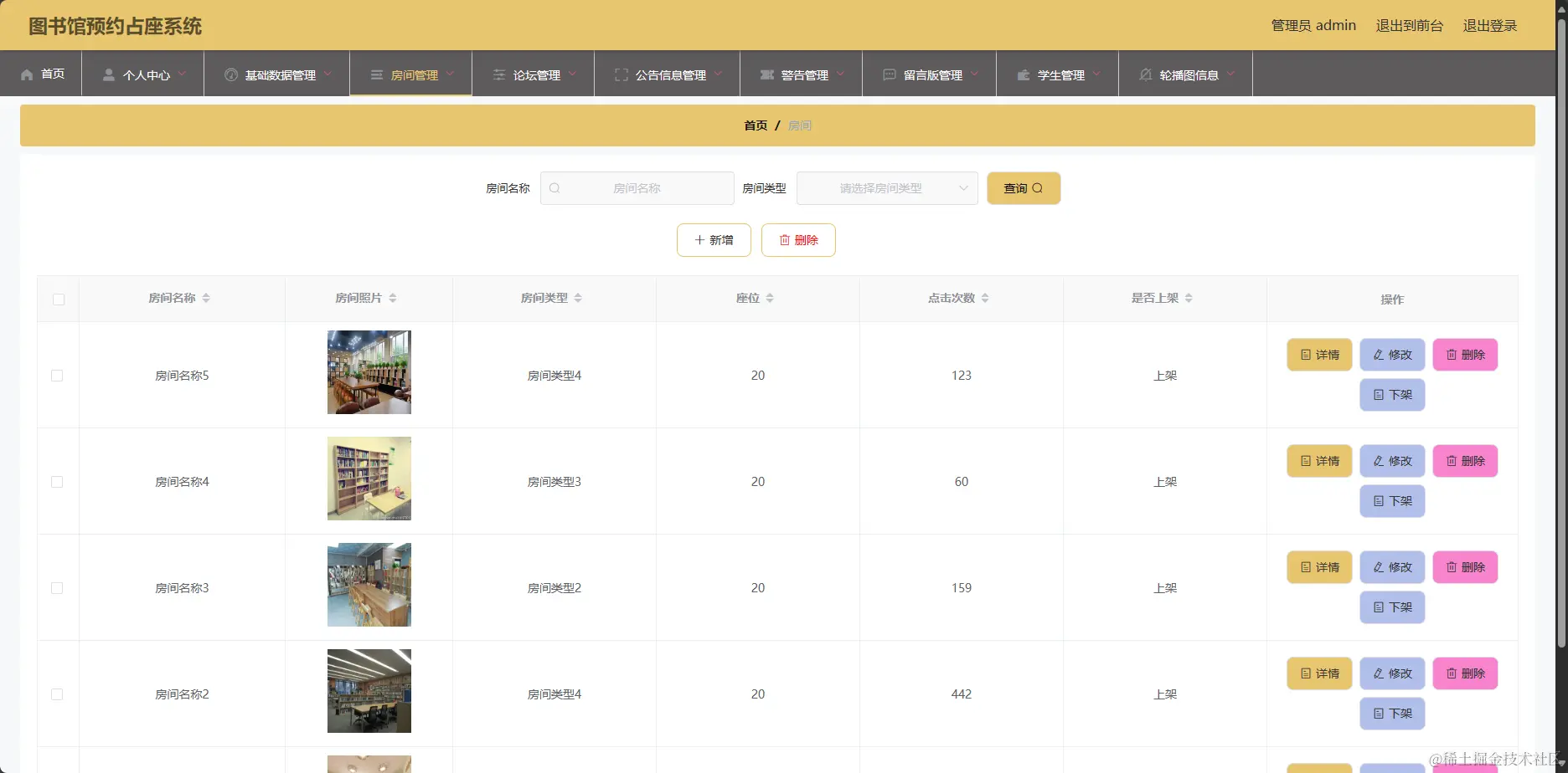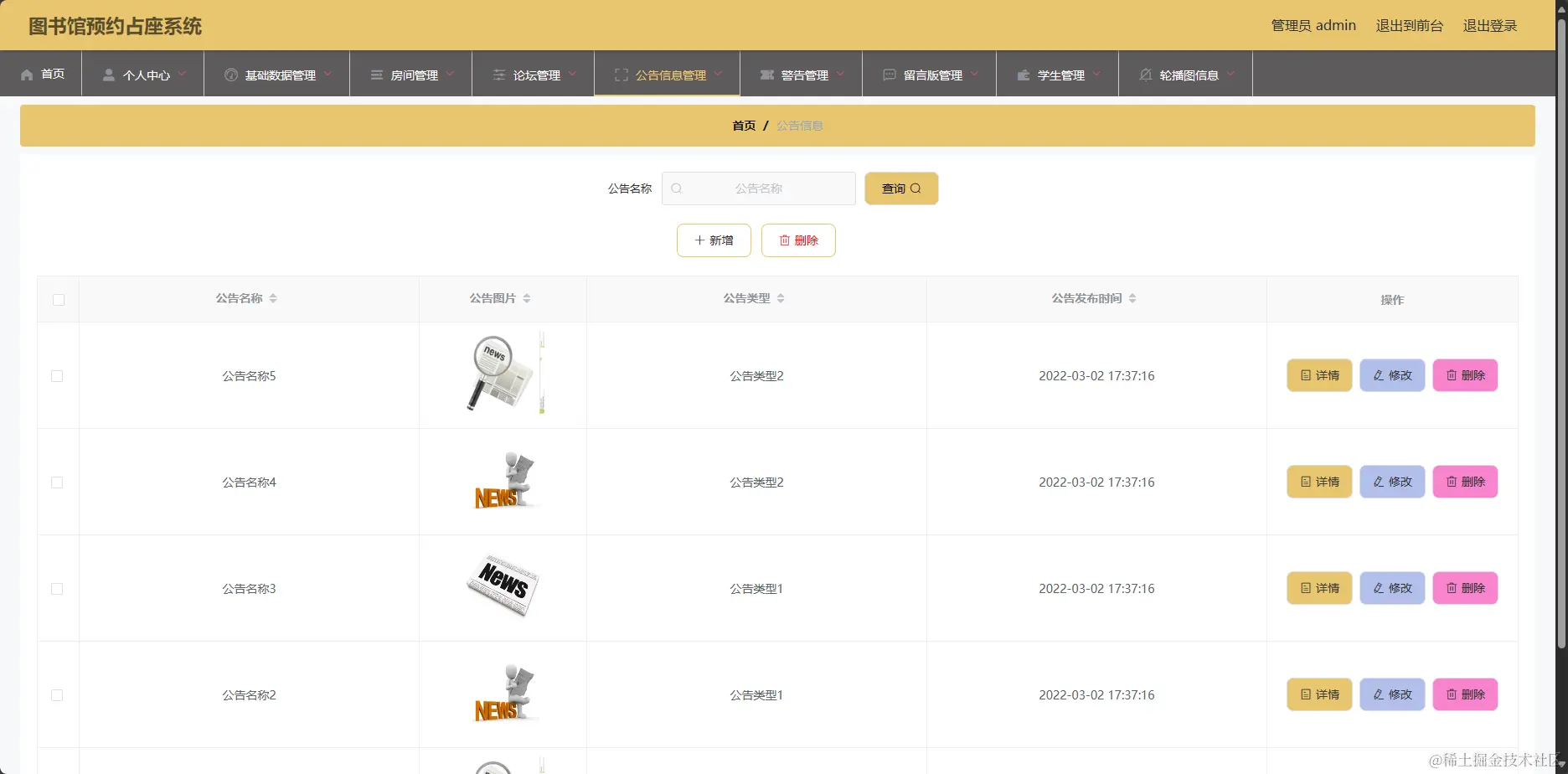 图书馆预约占座系统通过MySQL数据库与Eclipse工具进行开发,图书馆预约占座系统能够实现房间管理,论坛管理,警告管理,留言版管理,学生管理,房间占座管理,基础数据管理等功能。