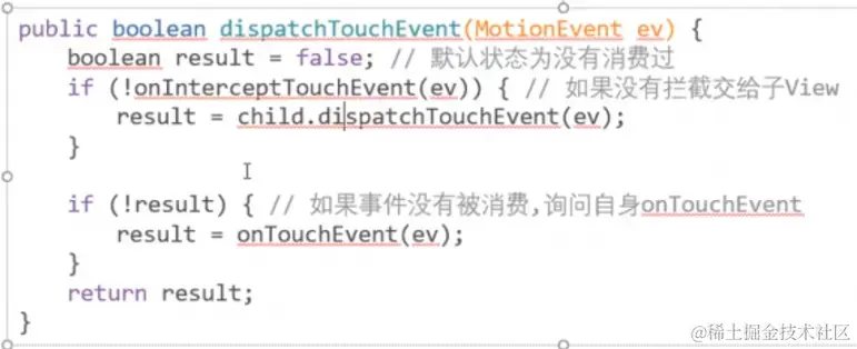 当一个Touch事件(触摸事件为例)到达根节点,即Acitivty的ViewGroup时,它会依次下发,下发的过程是调用子View(ViewGroup)的dispatchTouchEvent方法实现的。