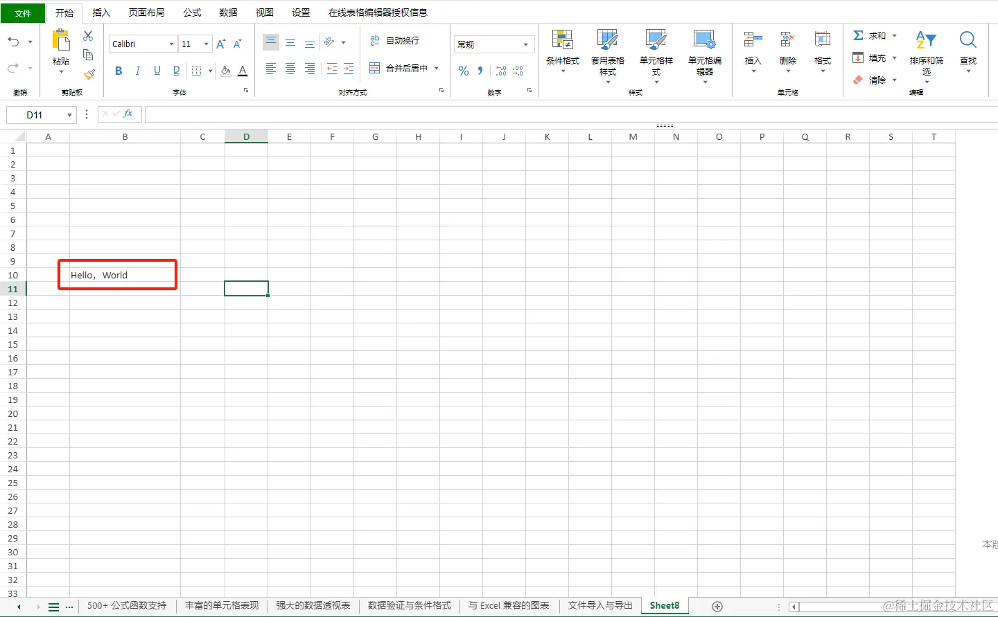 然后我们随便找一个空白的单元格,输入以下公式,空格中输入显示信息的单元格位置(比如上图中的“Hello World”的位置B10)