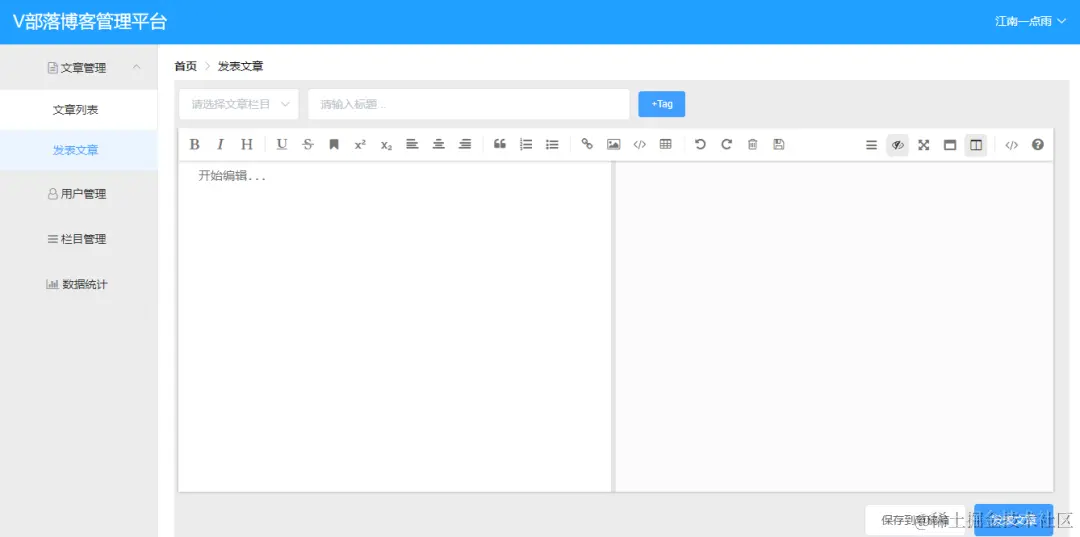 V 部落是一个多用户博客管理平台,采用 Vue + SpringBoot + ElementUI 开发。这个项目最大的优势是简单,属于功能完整但是又非常简单的那种,非常非常适合初学者。
