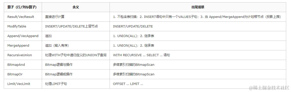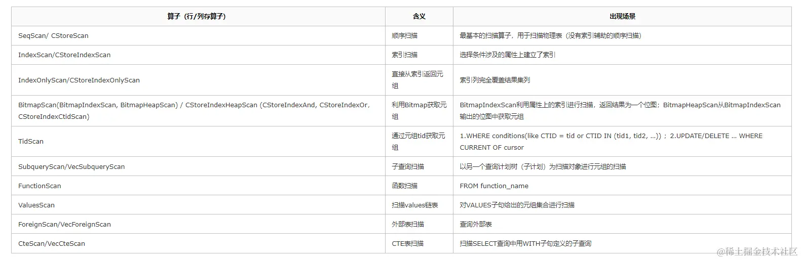 扫描算子用来扫描表中的数据,每次获取一条元组作为上层节点的输入, 存在于查询计划树的叶子节点,它不仅可以扫描表,还可以扫描函数的结果集、链表结构、子查询结果集。一些比较常见的扫描算子如表所示。