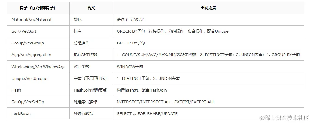 连接算子对应了关系代数中的连接操作,以表 t1 join t2 为例,主要的集中连接类型如下:inner join、left join、right join、full join、semi join、 anti join,其实现方式包括Nestloop、HashJoin、MergeJoin;