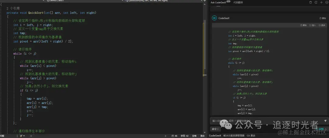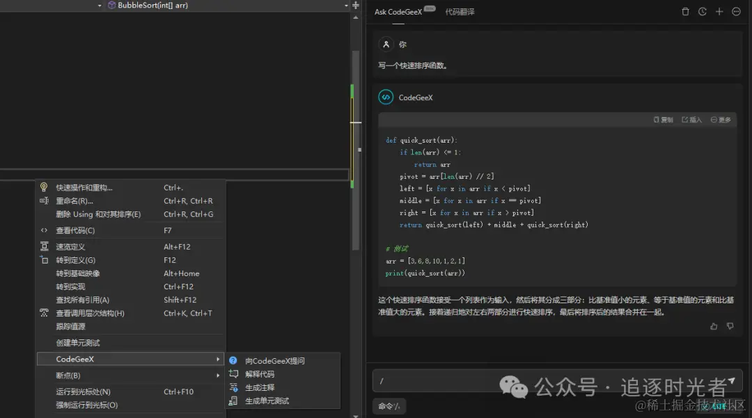 CodeGeeX是一款基于大模型的智能编程助手,它可以实现代码的生成与补全、自动为代码添加注释、自动解释代码、自动编写单元测试、实现代码审查Code Review、自动修复代码fixbug、自动生成commit message完成git提交,以及在不同编程语言的代码间实现互译、针对技术和代码问题的智能问答等丰富的功能。