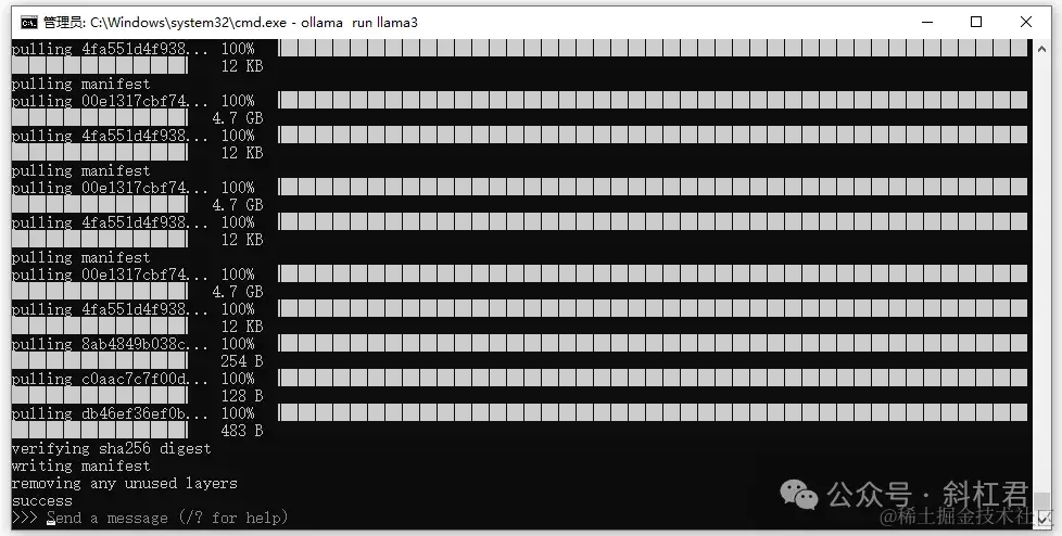 在窗口中键入cmd调出控制台,在控制台中运行命令:ollama run llama3