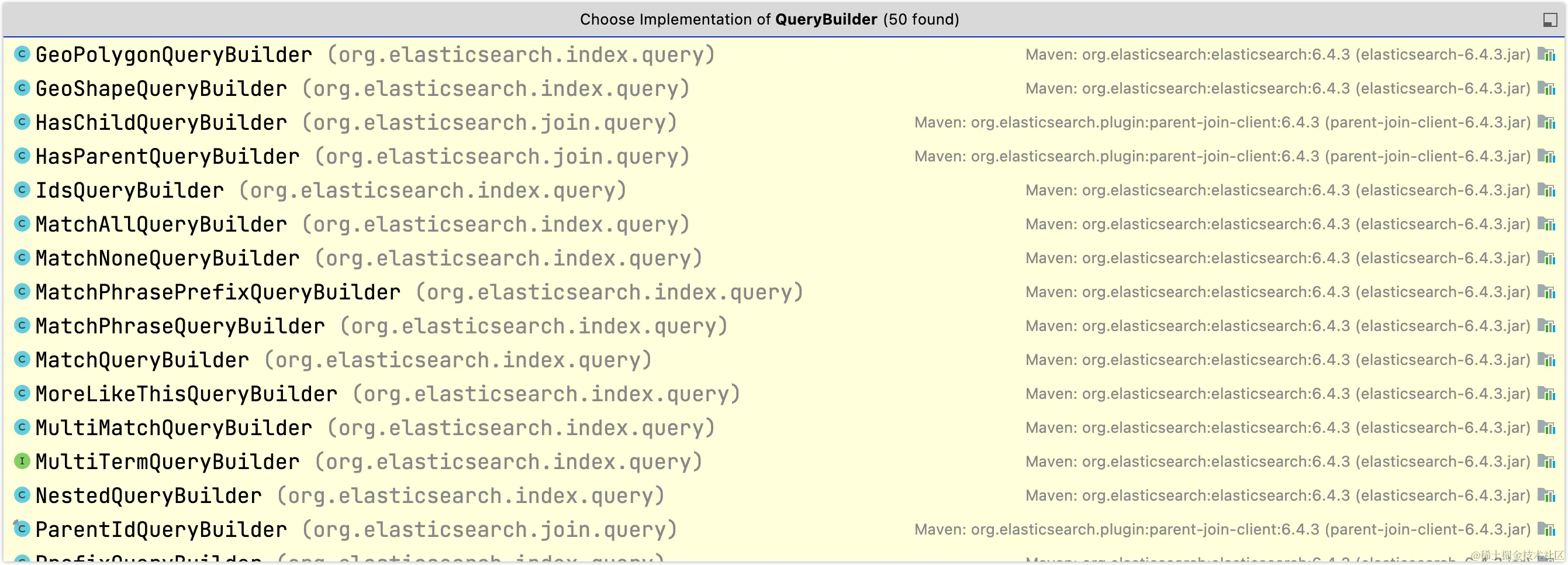 这个接口提供了很多实现类,分别对应我们在之前学习的不同类型的查询。例如:term查询、match查询、range查询、boolean查询等。见下图(Mac快捷键:command+option+B):