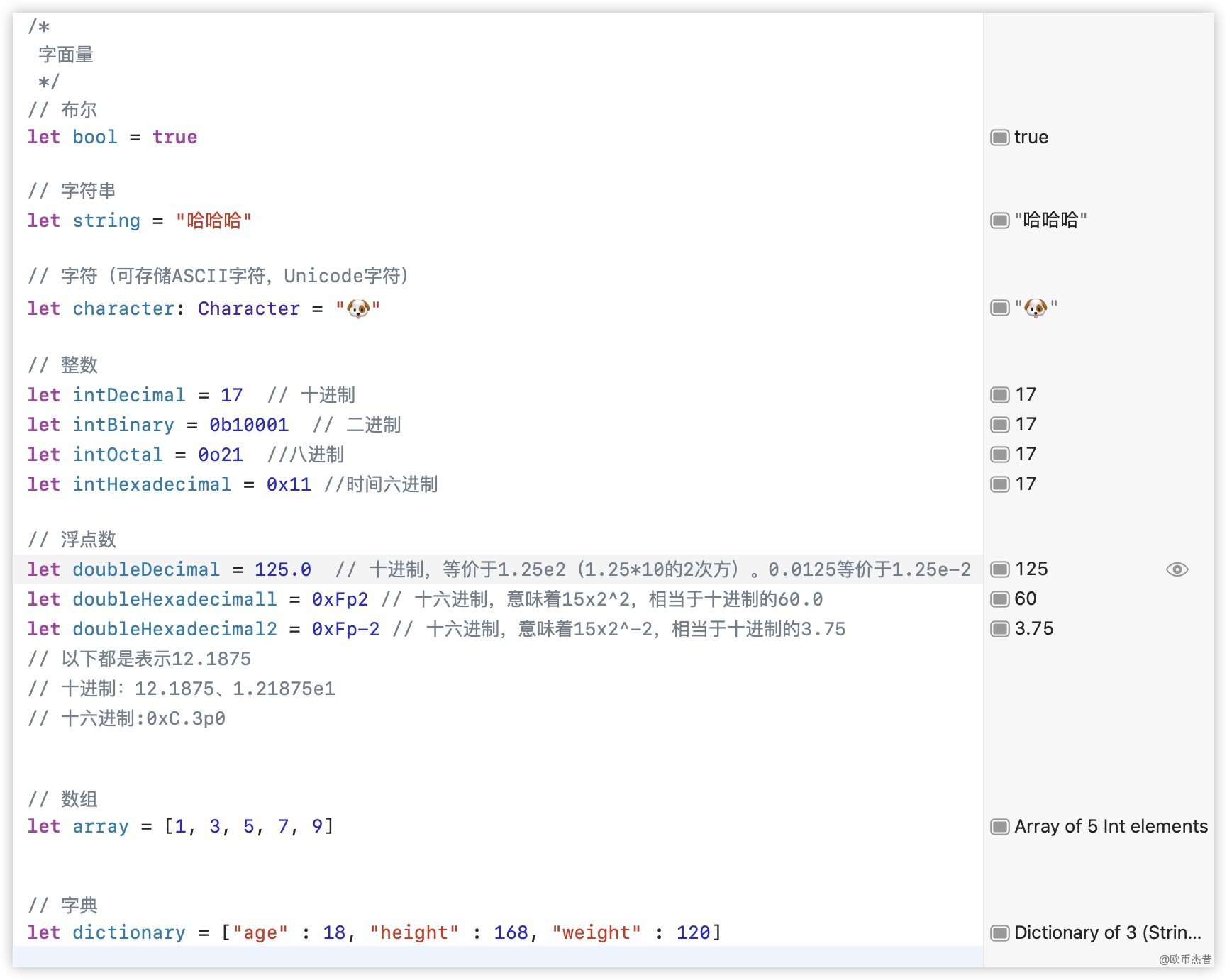 let doubleDecimal = 125.0 // 十进制,等价于1.25e2(1.25*10的2次方)。0.0125等价于1.25e-2